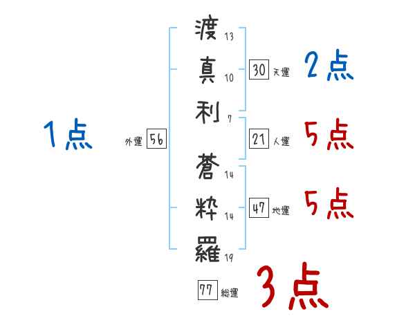 天運![]() | 渡真利蒼粋羅さんの天運は30画の2つ星!浮き沈みの激しさに注意しましょう。 家系が持つ宿命的な運勢を表します。祖先から受け継いだ苗字ですので自分の力が及びません。家柄を象徴します。 |