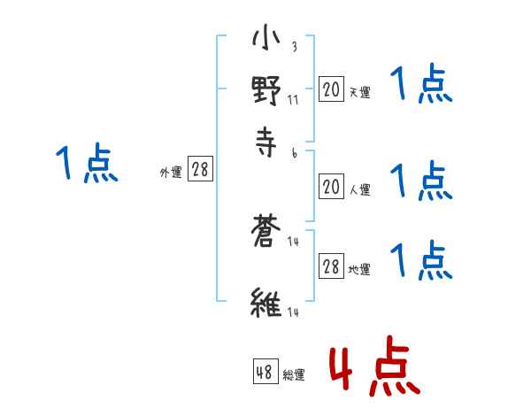 外運![]() | 小野寺蒼維さんの外運は28画の1つ星!家庭環境に注意。スポーツで活躍できる能力があるかも。 生活面を象徴する運勢です。外部から受ける影響力を表し、結婚運、家庭運や職場、環境への順応性を表します。 |