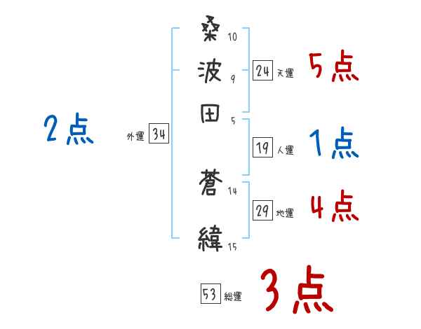 天運![]() | 桑波田蒼緯さんの天運は24画の5つ星!家庭運が良く順調な人生。金運にも恵まれる。 家系が持つ宿命的な運勢を表します。祖先から受け継いだ苗字ですので自分の力が及びません。家柄を象徴します。 |