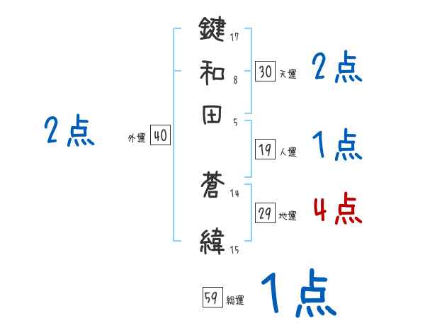 総運![]() | 鍵和田蒼緯さんの総運は59画の1つ星!意志の弱さであきらめることが多いかも。粘り強さが必要。 あなたの人生を表す1番重要な運勢です。生涯を通じて影響する総合運となり、主に50歳以降の晩年期に影響を及ぼします。 |
