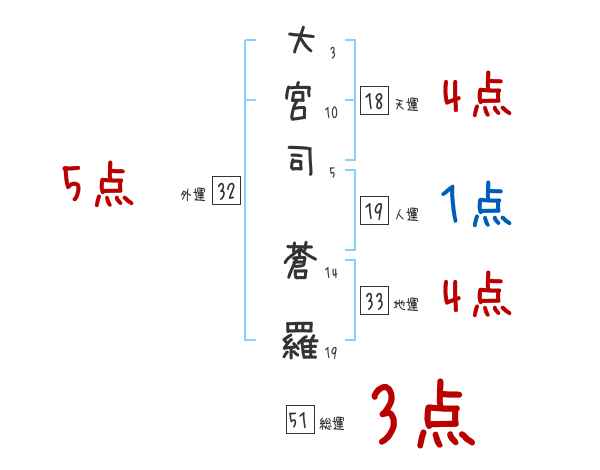 外運![]() | 大宮司蒼羅さんの外運は32画の5つ星!柔軟性があり成功する。チャンスが多く金運が良い。 生活面を象徴する運勢です。外部から受ける影響力を表し、結婚運、家庭運や職場、環境への順応性を表します。 |
