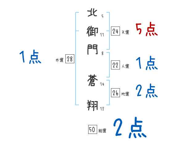 天運![]() | 北御門蒼翔さんの天運は24画の5つ星!家庭運が良く順調な人生。金運にも恵まれる。 家系が持つ宿命的な運勢を表します。祖先から受け継いだ苗字ですので自分の力が及びません。家柄を象徴します。 |