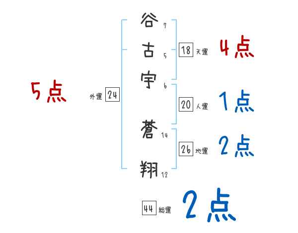天運![]() | 谷古宇蒼翔さんの天運は18画の4つ星!情熱的で剛気。忍耐力があり信頼される。 家系が持つ宿命的な運勢を表します。祖先から受け継いだ苗字ですので自分の力が及びません。家柄を象徴します。 |