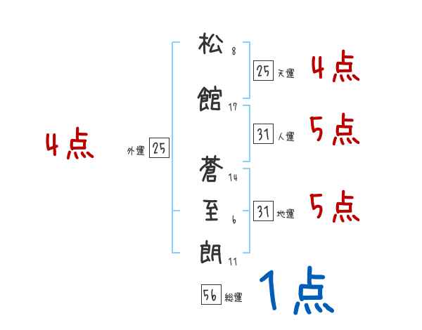 天運![]() | 松館蒼至朗さんの天運は25画の4つ星!個性があり才能があふれる。強運の持ち主で発展する。 家系が持つ宿命的な運勢を表します。祖先から受け継いだ苗字ですので自分の力が及びません。家柄を象徴します。 |