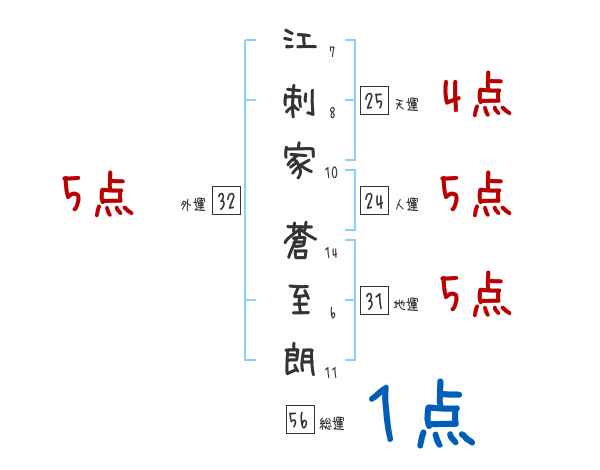 総運![]() | 江刺家蒼至朗さんの総運は56画の1つ星!消極的で無気力になりがち。誠実な気持ちが必要でしょう。 あなたの人生を表す1番重要な運勢です。生涯を通じて影響する総合運となり、主に50歳以降の晩年期に影響を及ぼします。 |