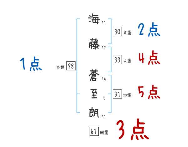 天運![]() | 海藤蒼至朗さんの天運は30画の2つ星!浮き沈みの激しさに注意しましょう。 家系が持つ宿命的な運勢を表します。祖先から受け継いだ苗字ですので自分の力が及びません。家柄を象徴します。 |