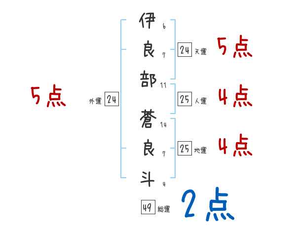 天運![]() | 伊良部蒼良斗さんの天運は24画の5つ星!家庭運が良く順調な人生。金運にも恵まれる。 家系が持つ宿命的な運勢を表します。祖先から受け継いだ苗字ですので自分の力が及びません。家柄を象徴します。 |