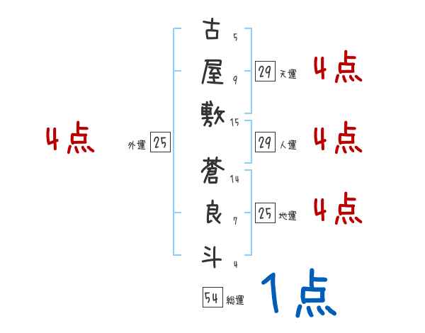 天運![]() | 古屋敷蒼良斗さんの天運は29画の4つ星!完全主義で才能がある。厳格な心の持ち主。 家系が持つ宿命的な運勢を表します。祖先から受け継いだ苗字ですので自分の力が及びません。家柄を象徴します。 |