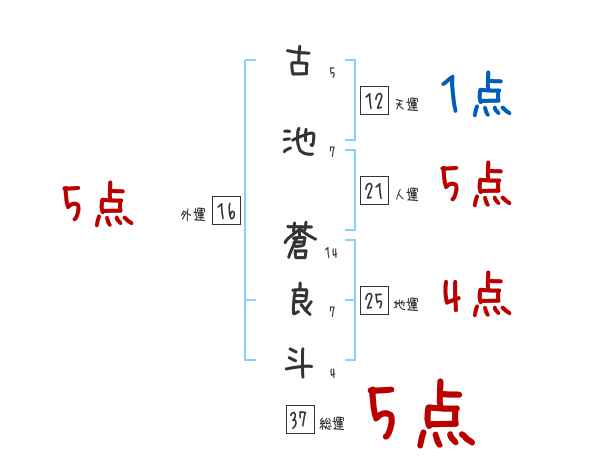 外運![]() | 古池蒼良斗さんの外運は16画の5つ星!人望が厚く大きく発展する。逆転成功が見える。 生活面を象徴する運勢です。外部から受ける影響力を表し、結婚運、家庭運や職場、環境への順応性を表します。 |