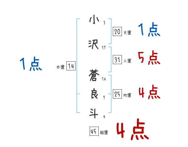 総運![]() | 小沢蒼良斗さんの総運は45画の4つ星!もくもくと物事を進め達成する。地味な努力家。 あなたの人生を表す1番重要な運勢です。生涯を通じて影響する総合運となり、主に50歳以降の晩年期に影響を及ぼします。 |