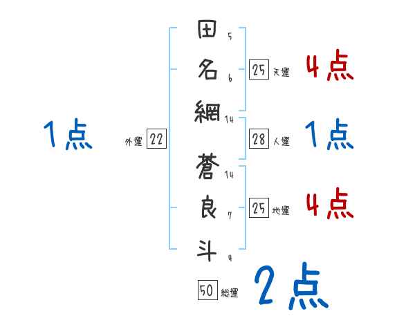 天運![]() | 田名網蒼良斗さんの天運は25画の4つ星!個性があり才能があふれる。強運の持ち主で発展する。 家系が持つ宿命的な運勢を表します。祖先から受け継いだ苗字ですので自分の力が及びません。家柄を象徴します。 |