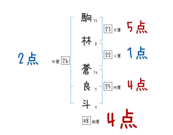 天運![]() | 駒林蒼良斗さんの天運は23画の5つ星!想像力に優れ活力がある。一代で成功し名誉を手に入れる。 家系が持つ宿命的な運勢を表します。祖先から受け継いだ苗字ですので自分の力が及びません。家柄を象徴します。 |
