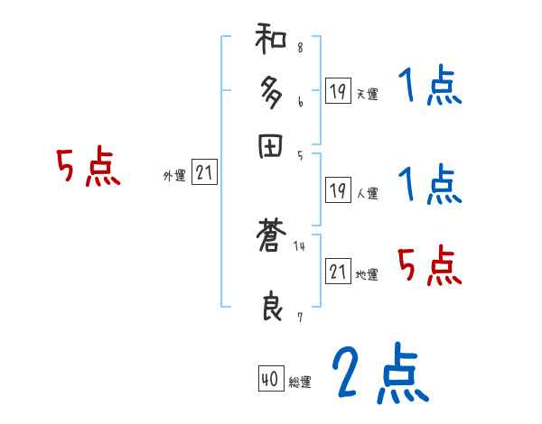 外運![]() | 和多田蒼良さんの外運は21画の5つ星!統率力がある。独立し成功する。名誉を手に入れる。 生活面を象徴する運勢です。外部から受ける影響力を表し、結婚運、家庭運や職場、環境への順応性を表します。 |