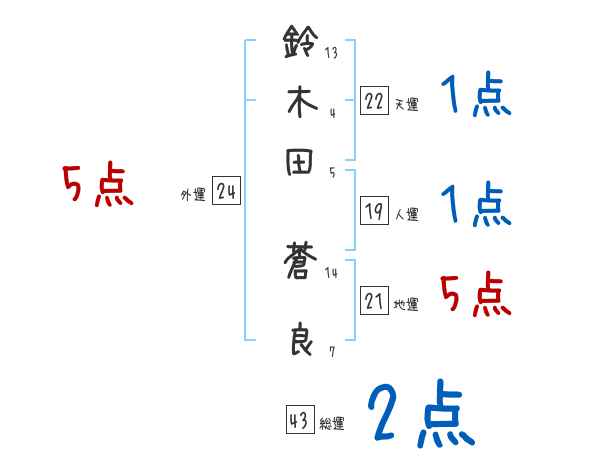 外運![]() | 鈴木田蒼良さんの外運は24画の5つ星!家庭運が良く順調な人生。金運にも恵まれる。 生活面を象徴する運勢です。外部から受ける影響力を表し、結婚運、家庭運や職場、環境への順応性を表します。 |