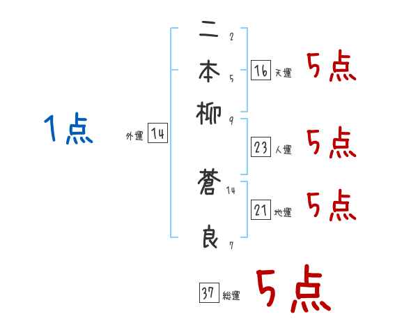 人運![]() | 二本柳蒼良さんの人運は23画の5つ星!想像力に優れ活力がある。一代で成功し名誉を手に入れる。 性格や才能などを表す2番目に重要な運勢です。人間関係や協調性、社会的な成功に影響します。主に20歳から50歳ぐらいまでの中年期の運勢を表します。 |