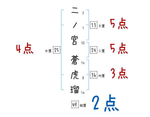 二ノ宮蒼虎瑠さんの画数の鑑定結果
