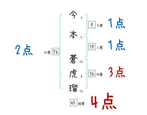 天運![]() | 今本蒼虎瑠さんの天運は9画の1つ星!消極的で才能を発揮することが苦手なことも。周りの意見に耳を傾けましょう。 家系が持つ宿命的な運勢を表します。祖先から受け継いだ苗字ですので自分の力が及びません。家柄を象徴します。 |