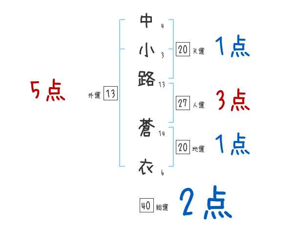 外運![]() | 中小路蒼衣さんの外運は13画の5つ星!才能に恵まれ人気がある。名声を手に入れる。円満な人生。 生活面を象徴する運勢です。外部から受ける影響力を表し、結婚運、家庭運や職場、環境への順応性を表します。 |