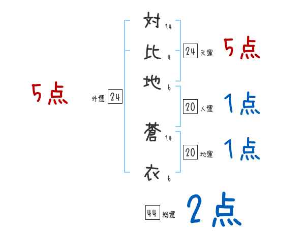 外運![]() | 対比地蒼衣さんの外運は24画の5つ星!家庭運が良く順調な人生。金運にも恵まれる。 生活面を象徴する運勢です。外部から受ける影響力を表し、結婚運、家庭運や職場、環境への順応性を表します。 |