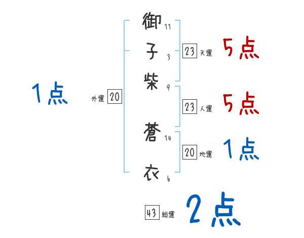 人運![]() | 御子柴蒼衣さんの人運は23画の5つ星!想像力に優れ活力がある。一代で成功し名誉を手に入れる。 性格や才能などを表す2番目に重要な運勢です。人間関係や協調性、社会的な成功に影響します。主に20歳から50歳ぐらいまでの中年期の運勢を表します。 |