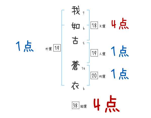 天運![]() | 我如古蒼衣さんの天運は18画の4つ星!情熱的で剛気。忍耐力があり信頼される。 家系が持つ宿命的な運勢を表します。祖先から受け継いだ苗字ですので自分の力が及びません。家柄を象徴します。 |