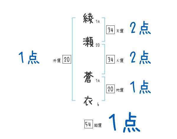 天運![]() | 綾瀬蒼衣さんの天運は34画の2つ星!独創性に優れるが、自尊心が強く災難に注意しましょう。 家系が持つ宿命的な運勢を表します。祖先から受け継いだ苗字ですので自分の力が及びません。家柄を象徴します。 |
