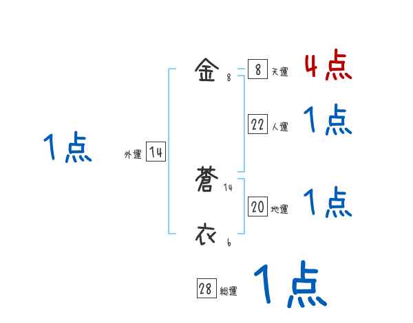天運![]() | 金蒼衣さんの天運は8画の4つ星!勤勉家。根気強く努力し成功する。忍耐力がある。 家系が持つ宿命的な運勢を表します。祖先から受け継いだ苗字ですので自分の力が及びません。家柄を象徴します。 |