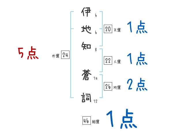 外運![]() | 伊地知蒼詞さんの外運は24画の5つ星!家庭運が良く順調な人生。金運にも恵まれる。 生活面を象徴する運勢です。外部から受ける影響力を表し、結婚運、家庭運や職場、環境への順応性を表します。 |