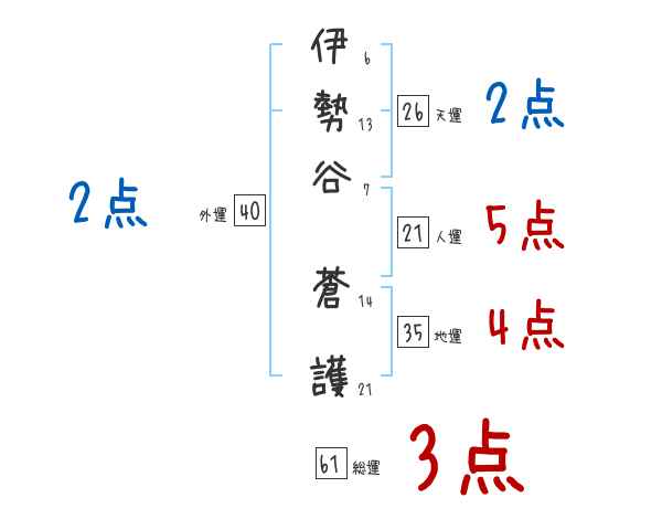 天運![]() | 伊勢谷蒼護さんの天運は26画の2つ星!波瀾万丈かも。信頼できる人を大事にしましょう。 家系が持つ宿命的な運勢を表します。祖先から受け継いだ苗字ですので自分の力が及びません。家柄を象徴します。 |