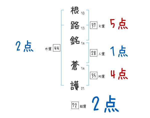 総運![]() | 根路銘蒼護さんの総運は72画の2つ星!災難が多く不安定な生活にならないように注意。明暗のある人生かも。 あなたの人生を表す1番重要な運勢です。生涯を通じて影響する総合運となり、主に50歳以降の晩年期に影響を及ぼします。 |