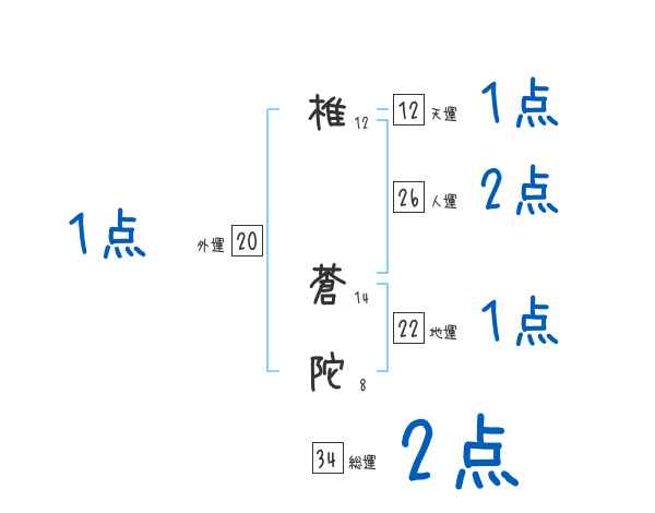 天運![]() | 椎蒼陀さんの天運は12画の1つ星!簡単な失敗で諦めてしまいやすいかも。着実に行動すると良いでしょう。 家系が持つ宿命的な運勢を表します。祖先から受け継いだ苗字ですので自分の力が及びません。家柄を象徴します。 |
