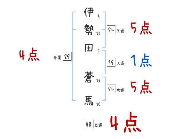 天運![]() | 伊勢田蒼馬さんの天運は24画の5つ星!家庭運が良く順調な人生。金運にも恵まれる。 家系が持つ宿命的な運勢を表します。祖先から受け継いだ苗字ですので自分の力が及びません。家柄を象徴します。 |