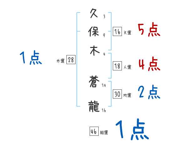 天運![]() | 久保木蒼龍さんの天運は16画の5つ星!人望が厚く大きく発展する。逆転成功が見える。 家系が持つ宿命的な運勢を表します。祖先から受け継いだ苗字ですので自分の力が及びません。家柄を象徴します。 |