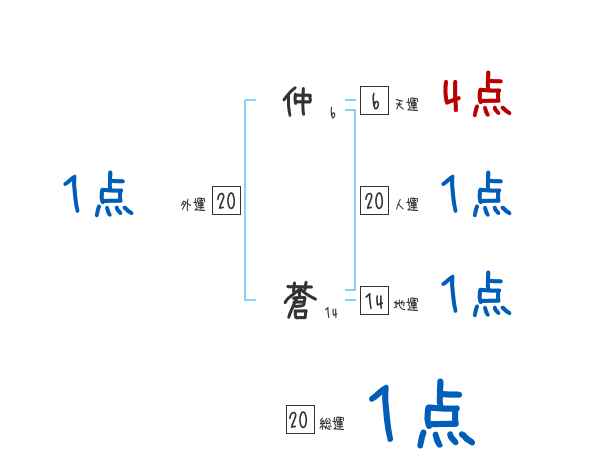 人運![]() | 仲蒼さんの人運は20画の1つ星!社交が苦手。人とは違った才能があり波乱万丈な人生かも。 性格や才能などを表す2番目に重要な運勢です。人間関係や協調性、社会的な成功に影響します。主に20歳から50歳ぐらいまでの中年期の運勢を表します。 |