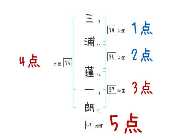 外運![]() | 三浦蓮一朗さんの外運は15画の4つ星!人徳があり出世する。順調に物事を進め円満な人生。 生活面を象徴する運勢です。外部から受ける影響力を表し、結婚運、家庭運や職場、環境への順応性を表します。 |