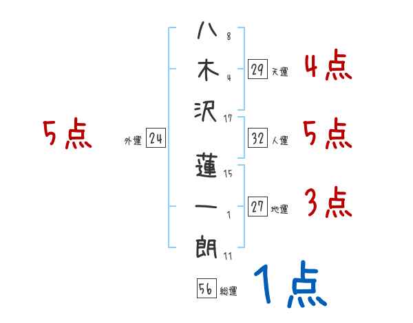 人運![]() | 八木沢蓮一朗さんの人運は32画の5つ星!柔軟性があり成功する。チャンスが多く金運が良い。 性格や才能などを表す2番目に重要な運勢です。人間関係や協調性、社会的な成功に影響します。主に20歳から50歳ぐらいまでの中年期の運勢を表します。 |