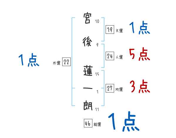 天運![]() | 宮後蓮一朗さんの天運は19画の1つ星!優れた才能を持ちますが、協調性が足りないことも。周りの人と協力する事を意識しましょう。 家系が持つ宿命的な運勢を表します。祖先から受け継いだ苗字ですので自分の力が及びません。家柄を象徴します。 |