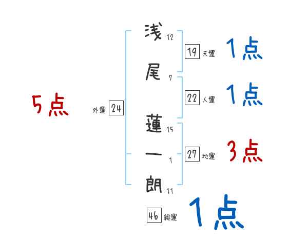 外運![]() | 浅尾蓮一朗さんの外運は24画の5つ星!家庭運が良く順調な人生。金運にも恵まれる。 生活面を象徴する運勢です。外部から受ける影響力を表し、結婚運、家庭運や職場、環境への順応性を表します。 |