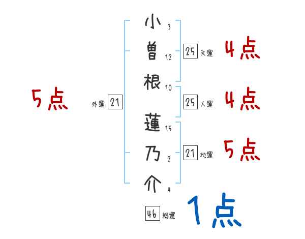 外運![]() | 小曽根蓮乃介さんの外運は21画の5つ星!統率力がある。独立し成功する。名誉を手に入れる。 生活面を象徴する運勢です。外部から受ける影響力を表し、結婚運、家庭運や職場、環境への順応性を表します。 |