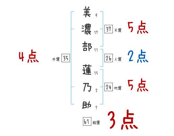 外運![]() | 美濃部蓮乃助さんの外運は35画の4つ星!温厚な性格で感受性が高い。穏和な性格で人望が厚い。 生活面を象徴する運勢です。外部から受ける影響力を表し、結婚運、家庭運や職場、環境への順応性を表します。 |