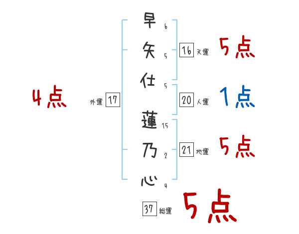 天運![]() | 早矢仕蓮乃心さんの天運は16画の5つ星!人望が厚く大きく発展する。逆転成功が見える。 家系が持つ宿命的な運勢を表します。祖先から受け継いだ苗字ですので自分の力が及びません。家柄を象徴します。 |