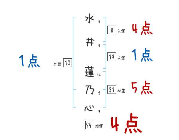 外運![]() | 水井蓮乃心さんの外運は10画の1つ星!不安を感じやすい傾向。ストレスを抱えないように注意しましょう。 生活面を象徴する運勢です。外部から受ける影響力を表し、結婚運、家庭運や職場、環境への順応性を表します。 |