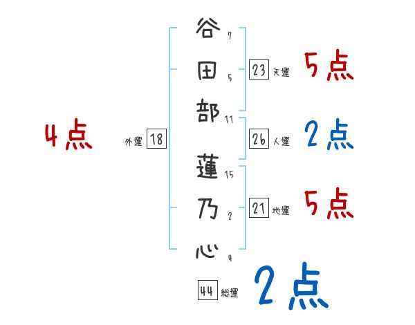 天運![]() | 谷田部蓮乃心さんの天運は23画の5つ星!想像力に優れ活力がある。一代で成功し名誉を手に入れる。 家系が持つ宿命的な運勢を表します。祖先から受け継いだ苗字ですので自分の力が及びません。家柄を象徴します。 |
