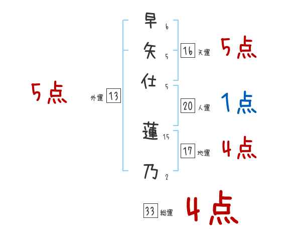 天運![]() | 早矢仕蓮乃さんの天運は16画の5つ星!人望が厚く大きく発展する。逆転成功が見える。 家系が持つ宿命的な運勢を表します。祖先から受け継いだ苗字ですので自分の力が及びません。家柄を象徴します。 |