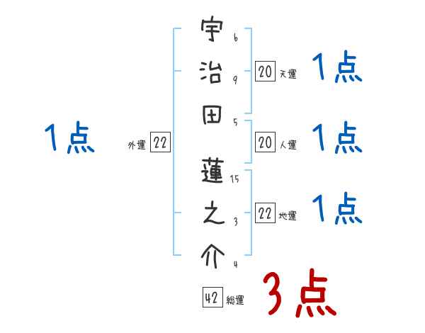 外運![]() | 宇治田蓮之介さんの外運は22画の1つ星!努力することが苦手ないっぽう手先が器用。芸術性にも優れる。 生活面を象徴する運勢です。外部から受ける影響力を表し、結婚運、家庭運や職場、環境への順応性を表します。 |