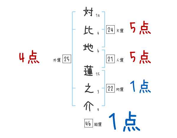 天運![]() | 対比地蓮之介さんの天運は24画の5つ星!家庭運が良く順調な人生。金運にも恵まれる。 家系が持つ宿命的な運勢を表します。祖先から受け継いだ苗字ですので自分の力が及びません。家柄を象徴します。 |