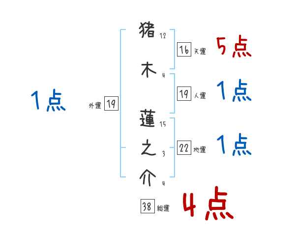 天運![]() | 猪木蓮之介さんの天運は16画の5つ星!人望が厚く大きく発展する。逆転成功が見える。 家系が持つ宿命的な運勢を表します。祖先から受け継いだ苗字ですので自分の力が及びません。家柄を象徴します。 |