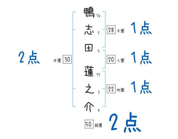 天運![]() | 鴨志田蓮之介さんの天運は28画の1つ星!家庭環境に注意。スポーツで活躍できる能力があるかも。 家系が持つ宿命的な運勢を表します。祖先から受け継いだ苗字ですので自分の力が及びません。家柄を象徴します。 |