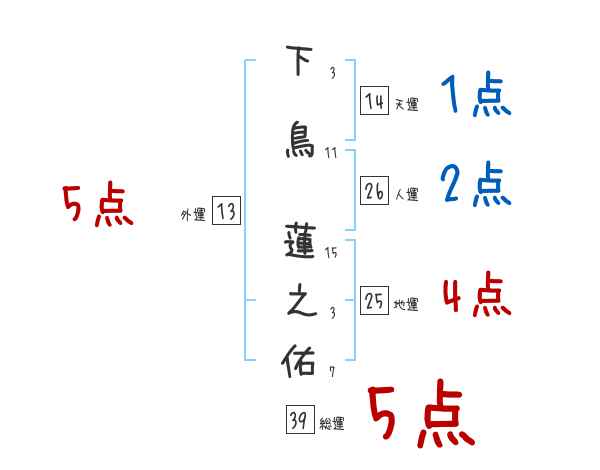 総運![]() | 下鳥蓮之佑さんの総運は39画の5つ星!社交性に優れ人望が厚い。人の上に立ち成功する。 あなたの人生を表す1番重要な運勢です。生涯を通じて影響する総合運となり、主に50歳以降の晩年期に影響を及ぼします。 |
