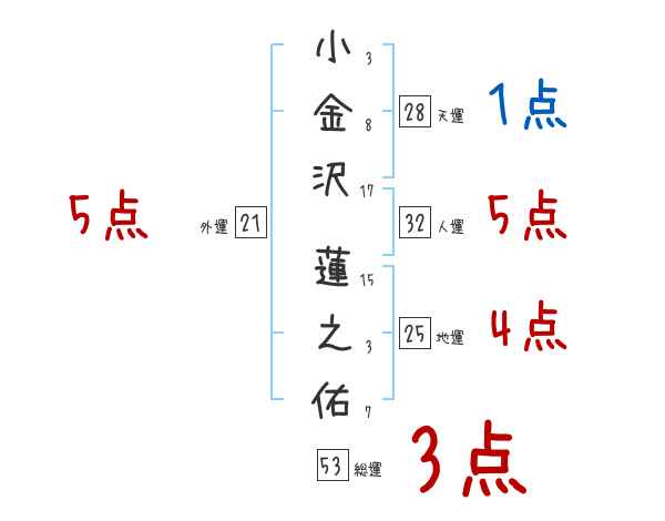 人運![]() | 小金沢蓮之佑さんの人運は32画の5つ星!柔軟性があり成功する。チャンスが多く金運が良い。 性格や才能などを表す2番目に重要な運勢です。人間関係や協調性、社会的な成功に影響します。主に20歳から50歳ぐらいまでの中年期の運勢を表します。 |